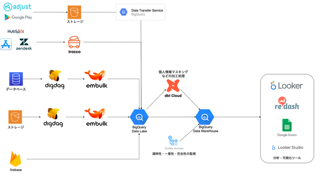 ## 募集背景 急速な事業成長に伴い、現在、組織としては今後の事業基盤を作るための組織化を推進するタイミングを迎えており、積極的な技術投資を通して事業成長スピードに応える開発体制を組成することに取り組んでいます。 タイミーでは、創業初期よりデータに基づいた意思決定を重視し事業運営を行っており、「データを使うのは当たり前」という文化が強く根付いています。 その中で、タイミーのミッション達成に向け、データ活用によるUX向上や営業生産性の向上への期待が一層高まっており、適切に仮説検証を行いビジネスに展開していくためには、データ活用におけるプロジェクトをリードいただける方の存在が不可欠です。 システムの活用に留まらず、「お客様が抱える『人』に関する経営課題の解決」や「個人の人生の可能性を広げるためのインフラをづくり」に情熱を持ち、タイミーだからこそ持ち得るデータを基盤としながら課題の特定〜仮説立て、必要な検証の把握を行い、プロジェクトの立ち上げからビジネスへの展開を推進いただける方を探しております。 ## 業務内容 * 社内の様々な組織に対するデータ活用PJの組成・進行管理をお願いします * ステークホルダーとのコミュニケーション及び、エンジニアやデータサイエンティストと協力してデータ活用を実装し、タイミーの事業を前進させます。 ▼扱っているデータ * アプリユーザーのアクセスログ、募集内容に関する情報 * マッチングに関する情報 * レビューや評価情報や、アプリインストールなどの広告効果に関わるデータ * 問い合わせに関するデータ * 営業活動情報のデータ ## 本ポジションの魅力 * 「スポットワーク」という新しい市場の先駆者として蓄積してきたデータを活用し、労働市場における社会的課題解決を通じて日本の活性化に貢献するやりがいを得られます。 * データ活用が当然というカルチャーが既に存在しているので、活用促進のような煩わしさは存在せず、データPjMとしての価値創出に集中できます。 * サービス・組織が急成長しているフェーズであるため、多岐にわたり、数多くのテーマが存在しています。 ## 技術スタック * 開発言語:Python * データ基盤:BigQuery / Fivetran / dbt Cloud * AI / LL:MVertex AI / Gemini / Langfuse * BIツール:Looker / Looker Studio * IaC:Terraform * 開発環境・ツール:Cursor / Claude Code / Devin / GAS etc ▼データパイプラインの全体図  ## データアナリティクス部の特徴 * 向上心のあるメンバーが多く、データアナリティクス部全体で週に約2〜3回の勉強会が実施されています。部を越えた勉強会も実施されており、自由に参加することができるため、自分の興味がある分野について学べる機会が多く存在しています。(参考記事:「 [*データアナリストの勉強会をご紹介します!*](https://tech.timee.co.jp/entry/2023/09/20/144453) 」) * 一人ひとりが自律的に技術力向上に取り組めるように成長をサポートする制度があります。※TDE10の取り組みについては [*こちら*](https://product-recruit.timee.co.jp/tde10) を参照ください * フレックス×リモートでの勤務が可能なため、自分自身が集中して働ける環境を選べます。 ※各自の在宅環境をリモートワークに最適化することを支援する制度があります。 * 心理的安全性が高い組織を目指しており、意見の言いやすい環境が整っています。(※参考記事「 [*心理的安全性の勉強会を開催しました*](https://tech.timee.co.jp/entry/2023/02/02/105555) 」) * データ基盤上にデータウェアハウスが整備されており、データの品質についてはデータエンジニアチームが管理をしているため、データアナリストが分析に集中できる環境が整っております。 * 経営陣を含め、データの重要性を理解している社員が多く、業務に対して非常に協力的です。 課題背景を十分に理解し、課題解決のために必要な分析を明確にしつつ、分析結果を元にどのようなアクションに繋がるのかを大事にしています。 ## 採用要件 ### MUST * SQL/Pythonを用いたデータ抽出・分析のご経験(3年以上) * データ活用に関するPJを率いたご経験 * 社内調整・顧客折衝に関するご経験 * 基本的なデータ分析・データサイエンスの知識 (自身が経験した領域のビジネスモデル及びデータの特徴や、分析事例・実績を説明できる) * データに関わるクラウドインフラの基本的な知識(data lake, data warehouse, data mart, ETLとはどのようなもので、どのような技術で実現できるか説明できる) ### WANT * 自らシステム・ソフトウェアを開発したご経験 * コンサルティングのご経験 * エンジニアとビジネス職をまとめたプロジェクト推進のご経験 * HR領域を始めとする、タイミー関連領域のドメイン知識 * AI/LLM に関する知見 (エージェント構築など) ### 基礎能力・スタンス * 心理的安全性を重視する方 * ビジネスセンスがありながら、エンジニアのカルチャーにフィット出来る方 * データの価値最大化に向けて、ビジネス要件とデータ・AI技術を接合出来る方