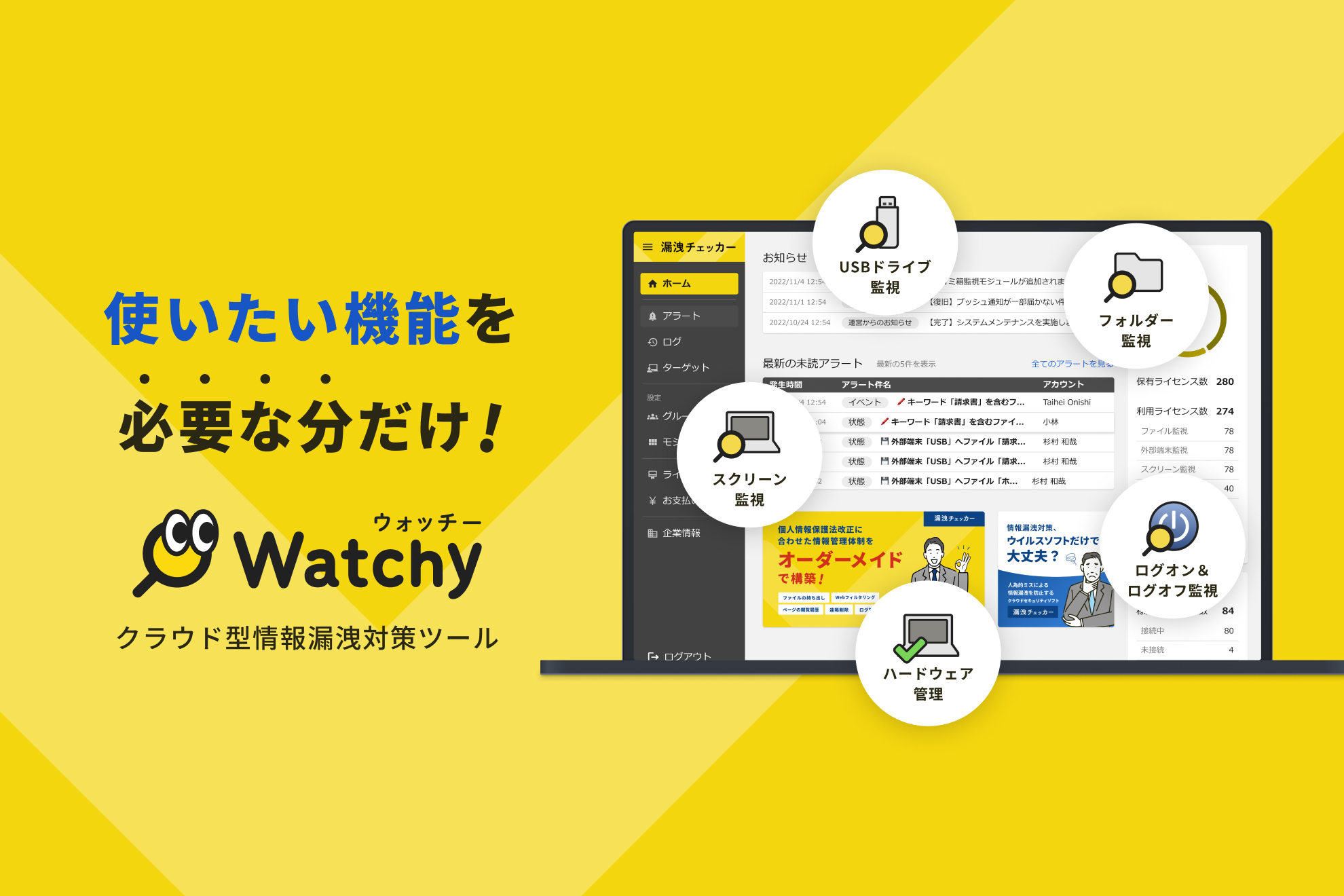 そこで、私たちはWatchyというプロダクトを立ち上げ、情報管理体制を構築する上で必要な機能群を提供しています。Watchyを利用する管理者はその機能群の中から必要な機能のみを選別することで、管理対象の各端末において発生した事象を監視することができ、情報漏洩の防止および問題の早期発見に繋がります。
